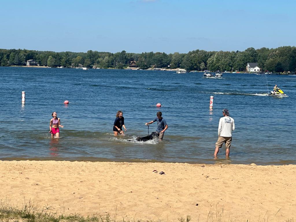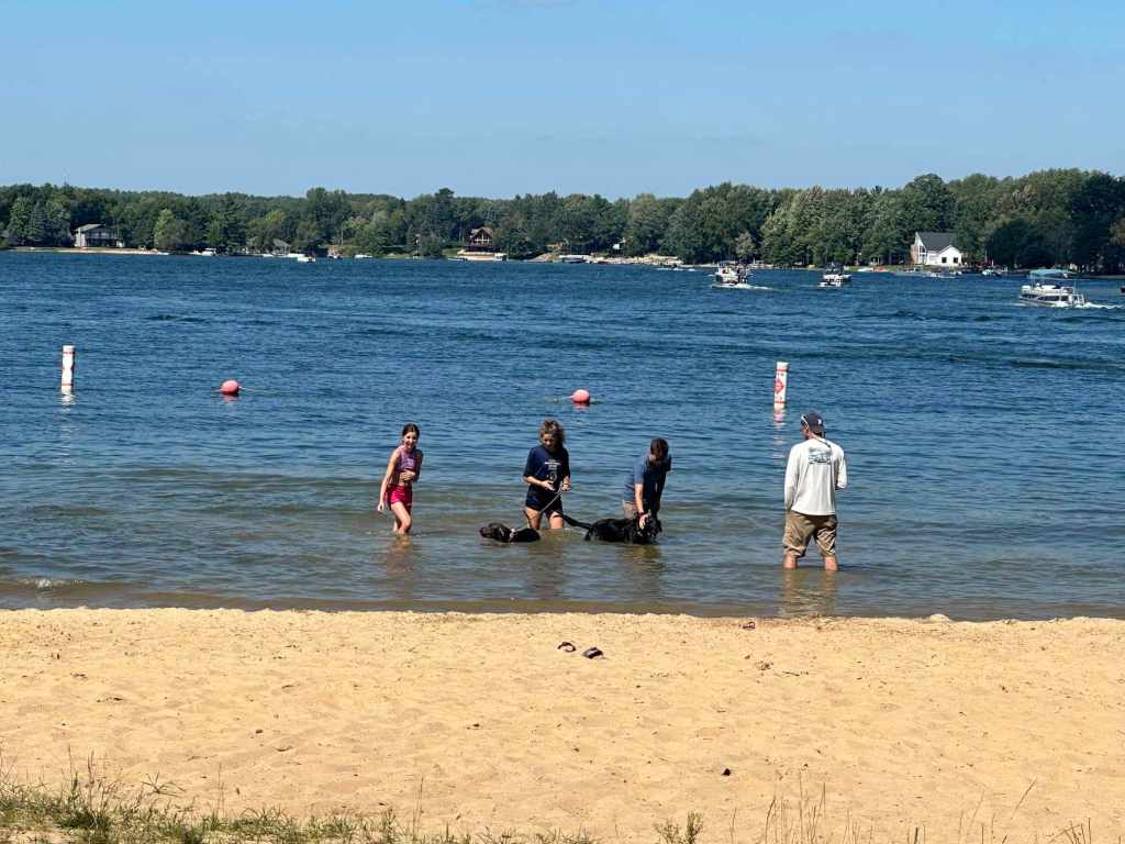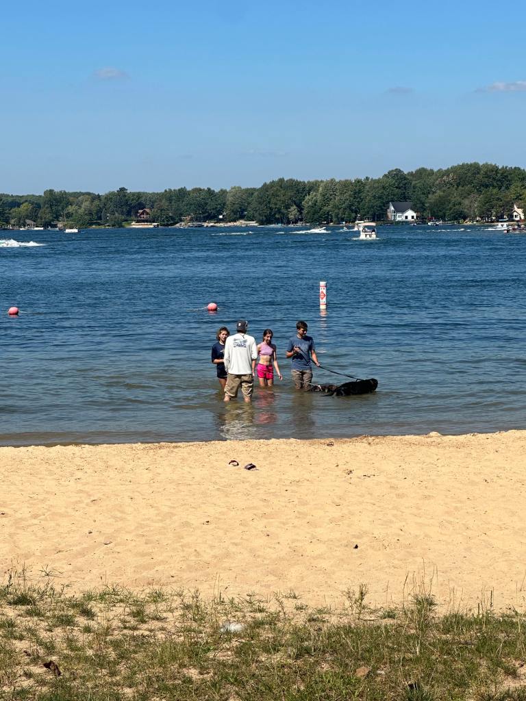 Before we left we took another ride in the golf cart. Heading down some paths that led to the lake. Mocha and Bowen went swimming in a lake for the first time ever. Mocha is a water dog, we knew she would love it. But we weren’t sure about Bowen. He is a lab, but we didn’t take him his first year and shortly after he turned 2 we had the accident. He had not liked the pool the few times he got in, but the lake was diffrent. I’m sure being able to touch his feet to the ground helped. It was great to see them playing. Mocha was jumping over Bowen and swimming to get Arianne. Mocha is fast in the water.
