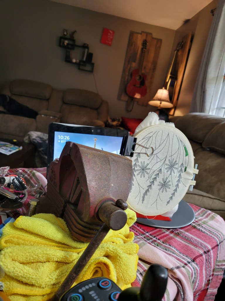 I tried embroidery again last week for the first time since the accident. We had to do a crazy creative way to hold the hoop, you know since only one arm and hand work. Photoor it didn’t happen right? 😁